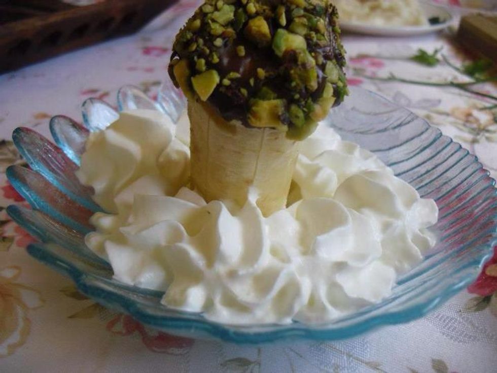 All ingredientsCut the bananasImmerse the bananas into chocloatePut the pistachios on the chocolateSpray the whipped cream around the banana