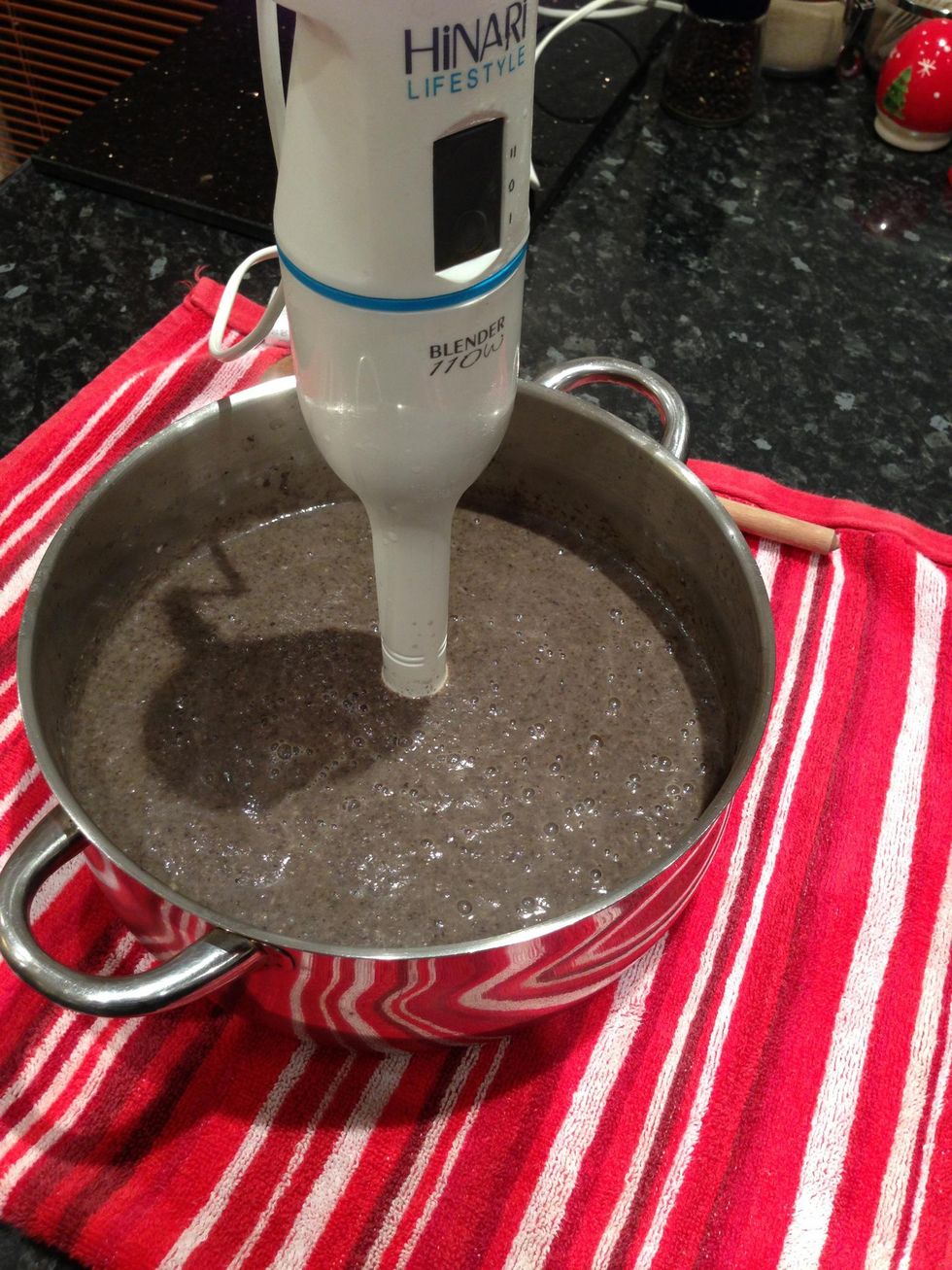 When cooked, remove pan from heat and blend until all ingredients are smooth