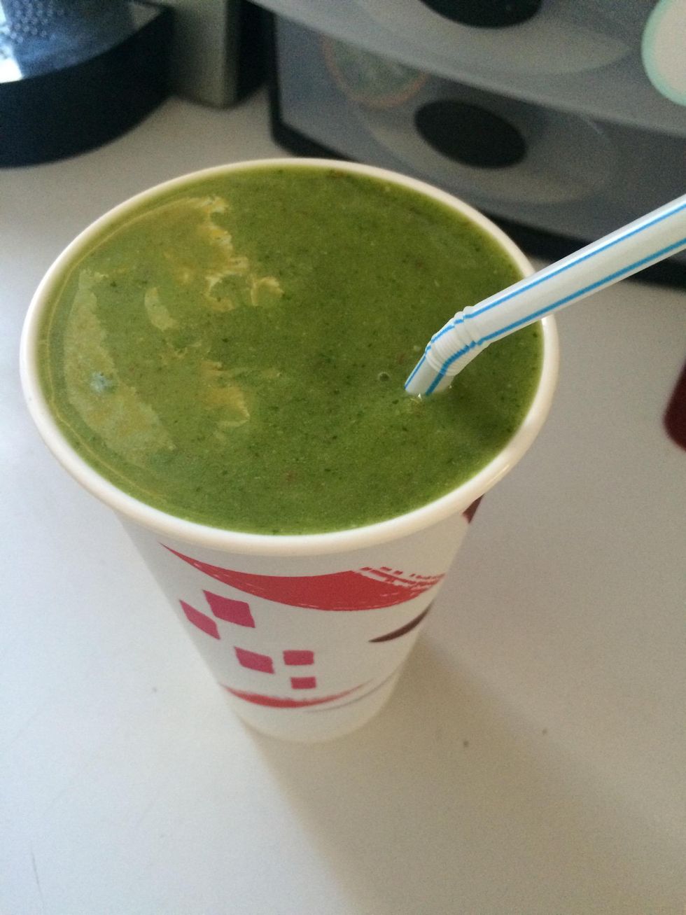 Add rinsed spinach to blenderAdd frozen bananaAdd frozen pineapple chunksFlaxseedMangoesOne cup of coconut water and one cup of pineapple juiceAdd one scoopAdd water and blend until desired consistencyMakes two