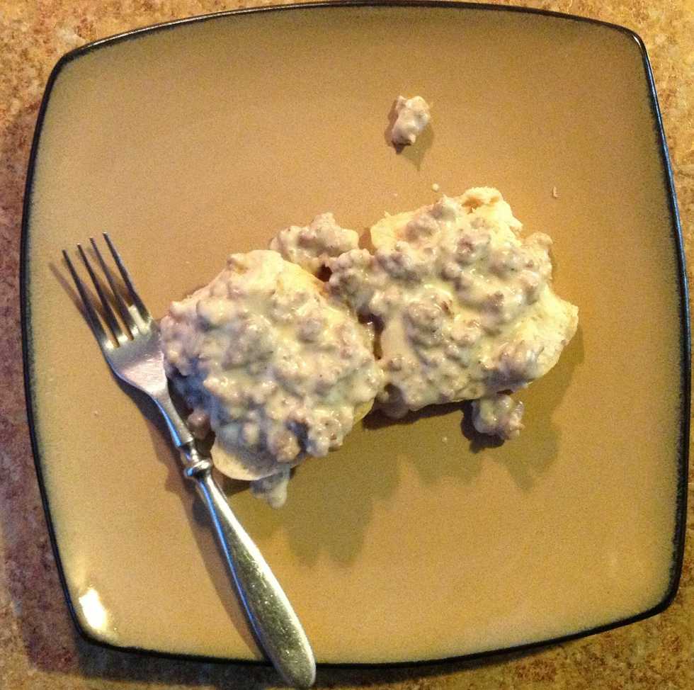 Divide a biscuit in half on a plate & top each half with some delicious sausage gravy. Now your ready to enjoy the best home cooked southern "Sausage Gravy & Biscuits".🍴🍲👩 Happy eats!