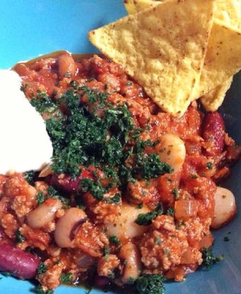 We served the chili with corn chips and sour cream but it also goes well with rice.