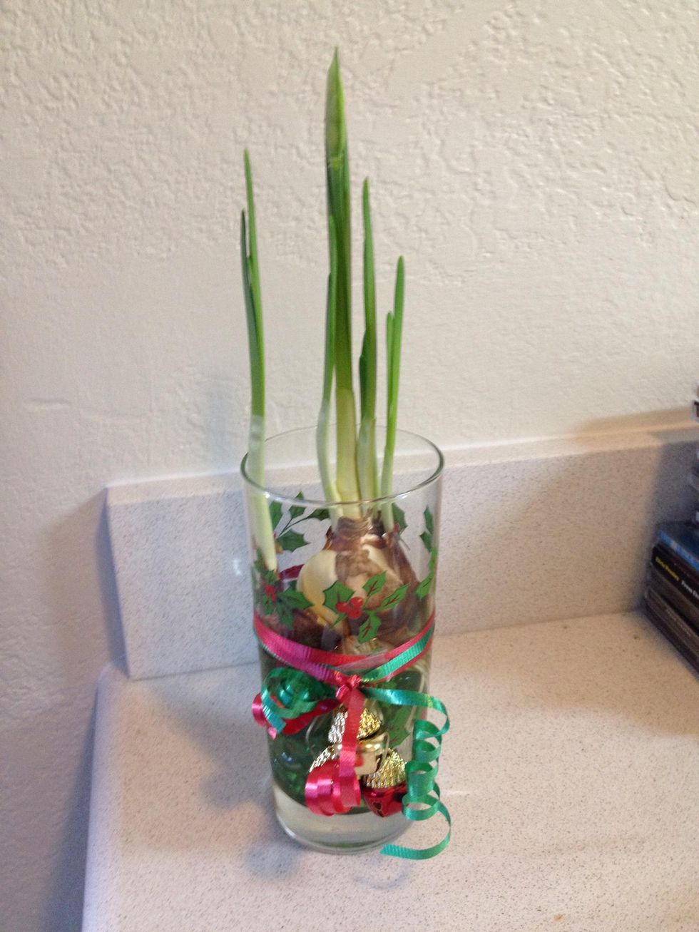 Wrap ribbons around vase and tie on jingle bells for extra festivity. These make great holiday party gifts, and the bulbs will bloom again next year.
