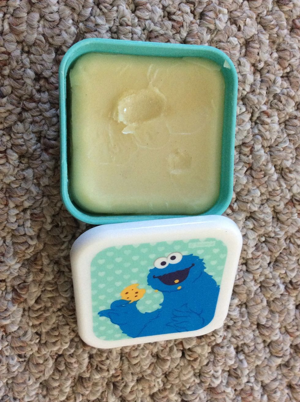 Non-fragranced "bar" I poured in a mold for my boyfriend. The Cookie Monster was a joke. ;) This body butter also good for healing scars, scratches, and skin rashes. Keep bar in mold in warm climates