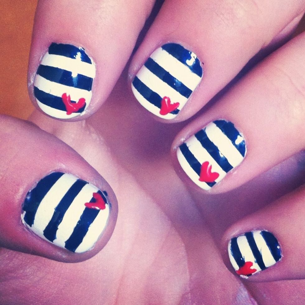 Once your nails are completely dry. You can draw hearts on each one with the bamboo skewer. I do some sort of "V" letter, start with the left side, up to down.