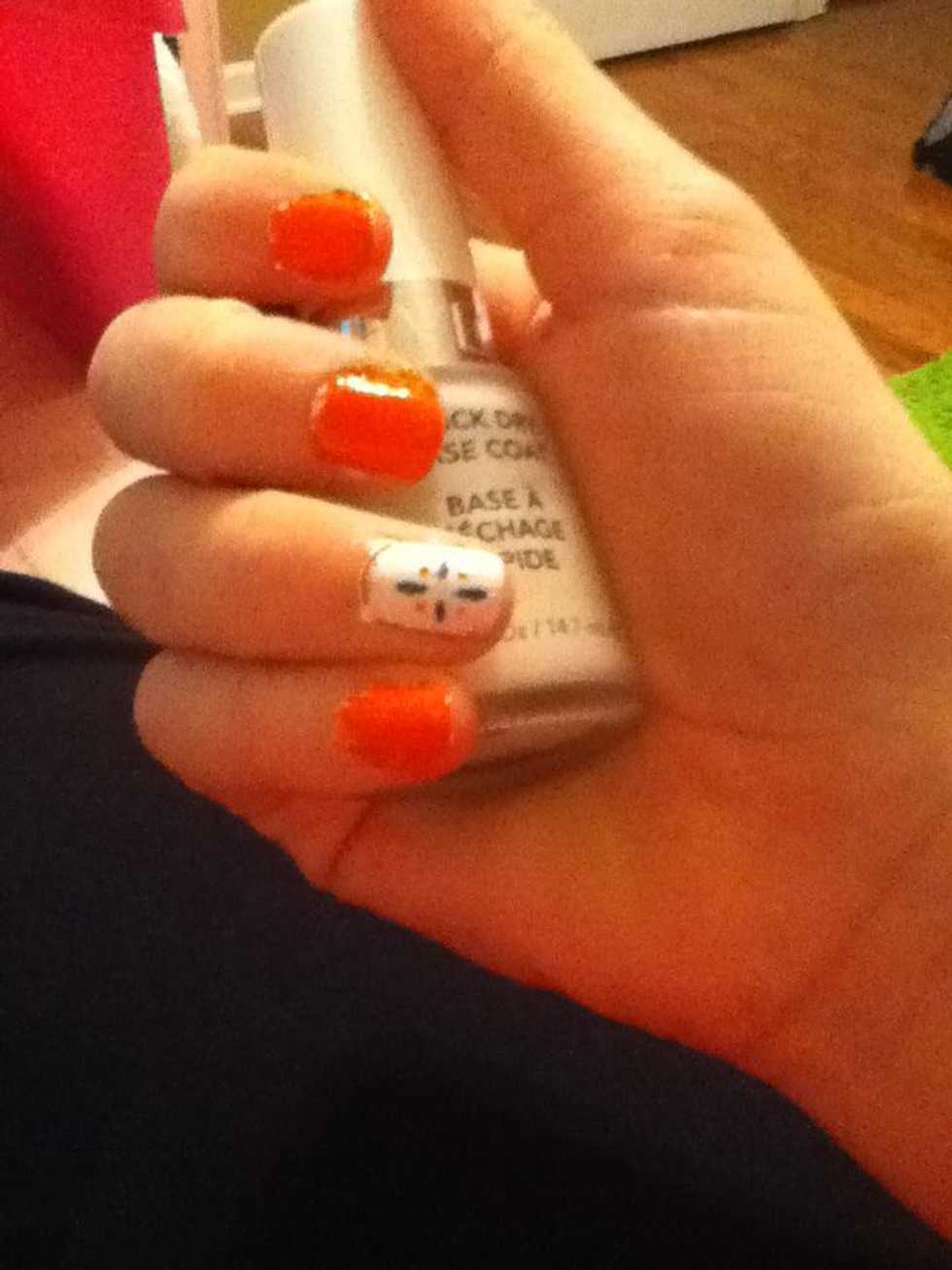 2nd coat. This was my design on my feature nail. I just took a toothpick and drew a line in a blue-ish color and dots in the neon orange color.
