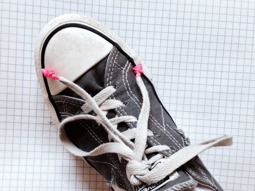 Gather your supplies.... You will need 2 bands for each shoelace So, you will need 8 for a pair of shoes :)Twist 1 of the bands on..tight!Twist the 2nd one on ;)Repeat with the other shoelace.All done!!! Now go and walk in neon style ;D