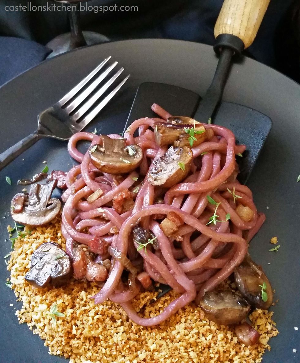 Add noodles to skillet with mushrooms and pancetta and stir fry until noodles are coated. To serve, top with additional thyme leaves and breadcrumbs and Enjoy!