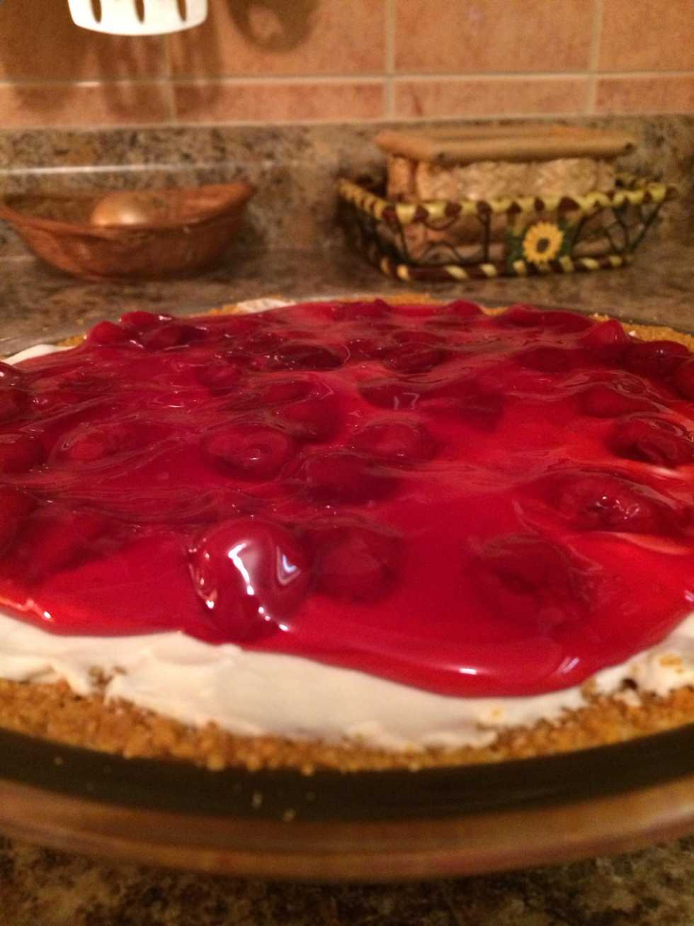 When you take the cake out you should be able to tell that the crust and filling has hardened a little bit. You will need cherry pie filling to top the cake. (Or any topping you want.)