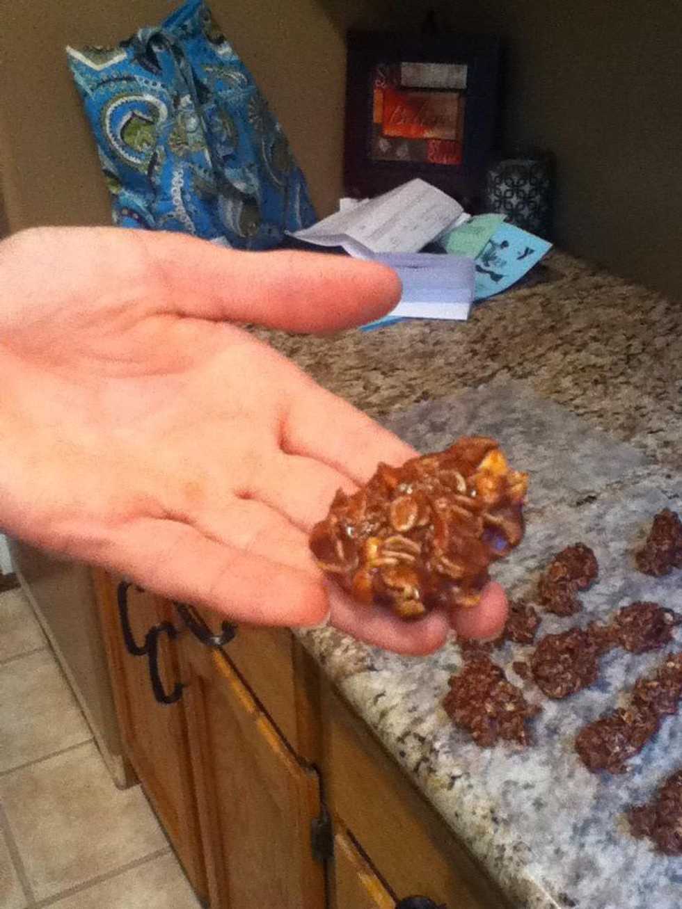 Spoon out 1 to 2 tablespoons onto wax paper (Do this step quickly, the cookies harden fast).