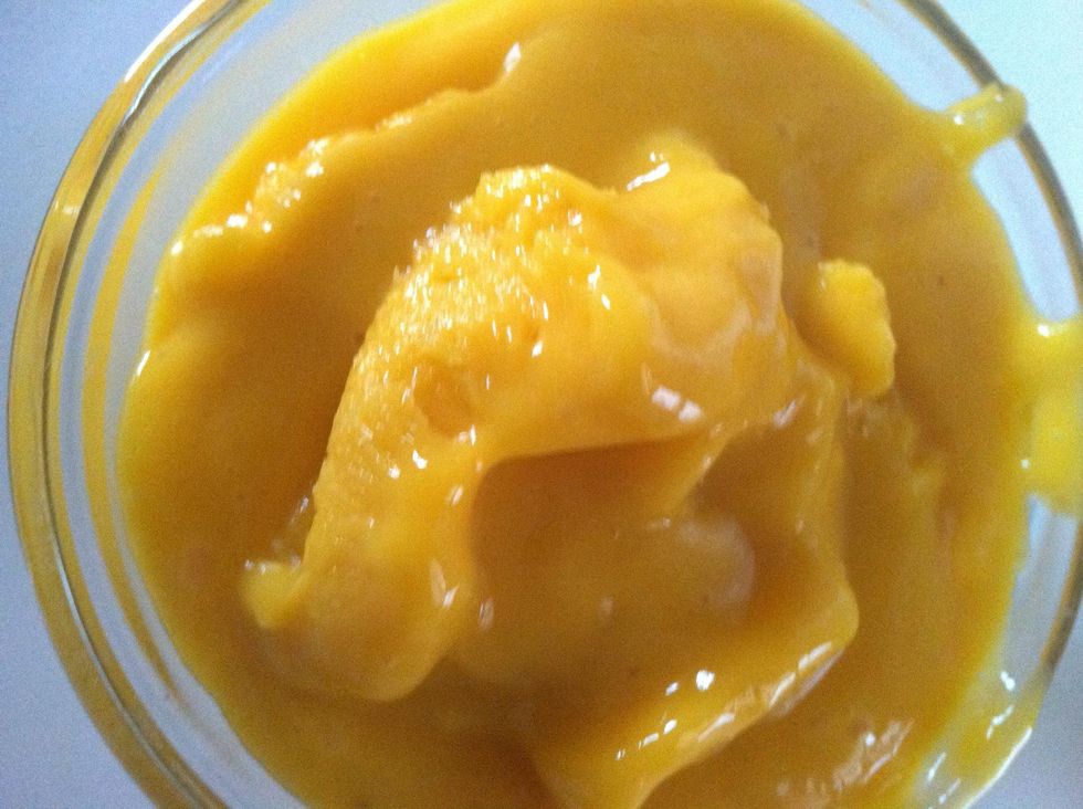 Add banana slices to chilled mango purée and yogurt. Blend.