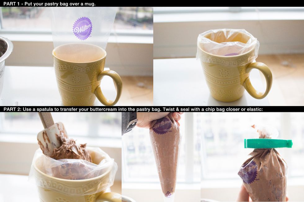 Prepare your pastry bag (or use a sandwich bag). Cut off the pointed end and place a Wilton 1M or 6B tip at the end.