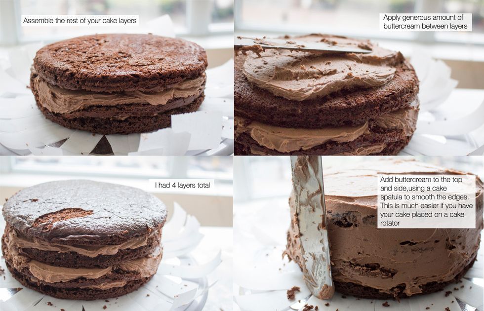 If you have this, use a bench scraper to smooth your buttercream layer (or cake spatula will suffice).