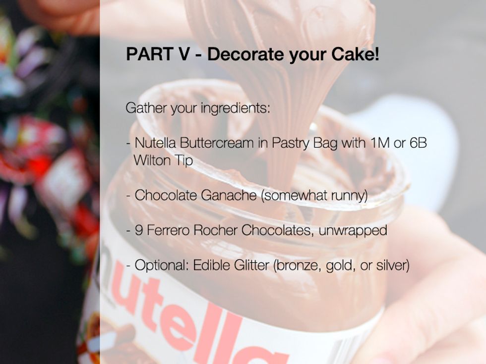 Take nutella buttercream (with 6B or 1M Wilton Tip) & pipe over the tick marks we made in the previous step in a small circular motion. Then add the ferrero rochers on top of each rosette we piped.