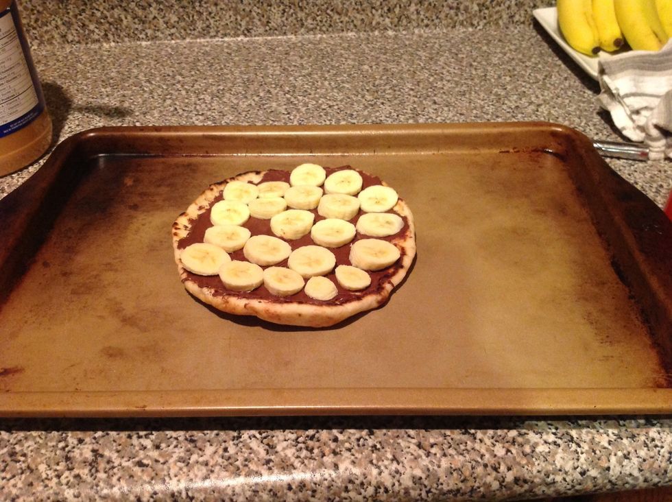 I added bananas because they are one of my favourite fruits. You can add strawberries, hazelnuts, or any topping of your choice! Spray a cooking sheet and get your pizza ready for the oven.