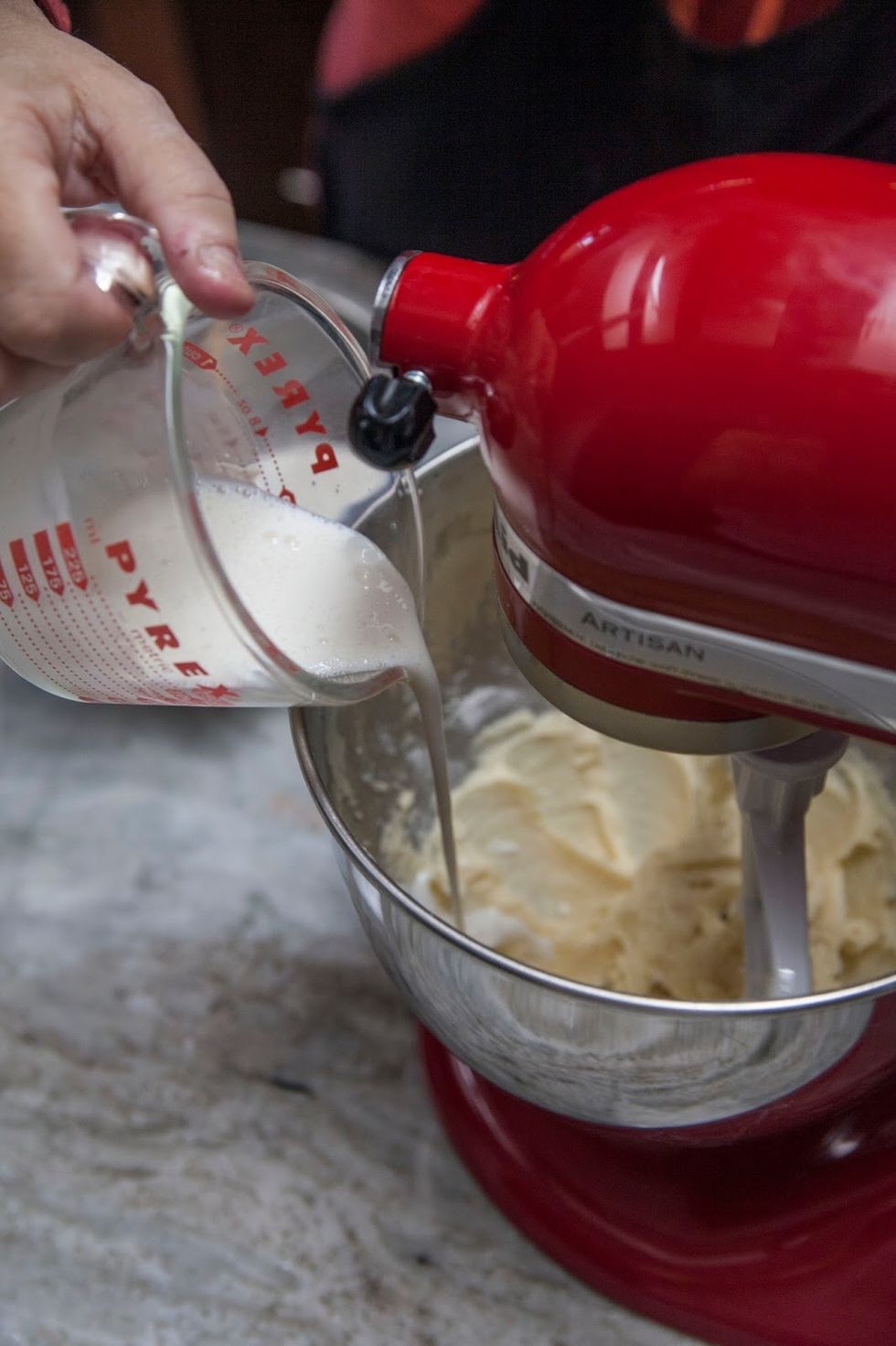 Mix the flour and the buttermilk into this separately in small batches, alternating them, starting and finishing with the flour.