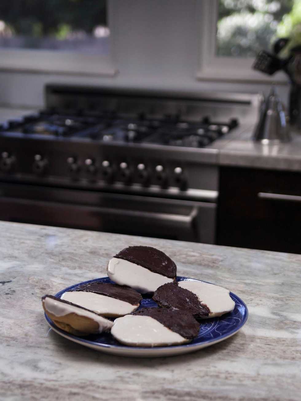 So, now you have two bowls of icing, one chocolate, one vanilla. Turn the cookies flat side up, and frost what used to be the bottom.