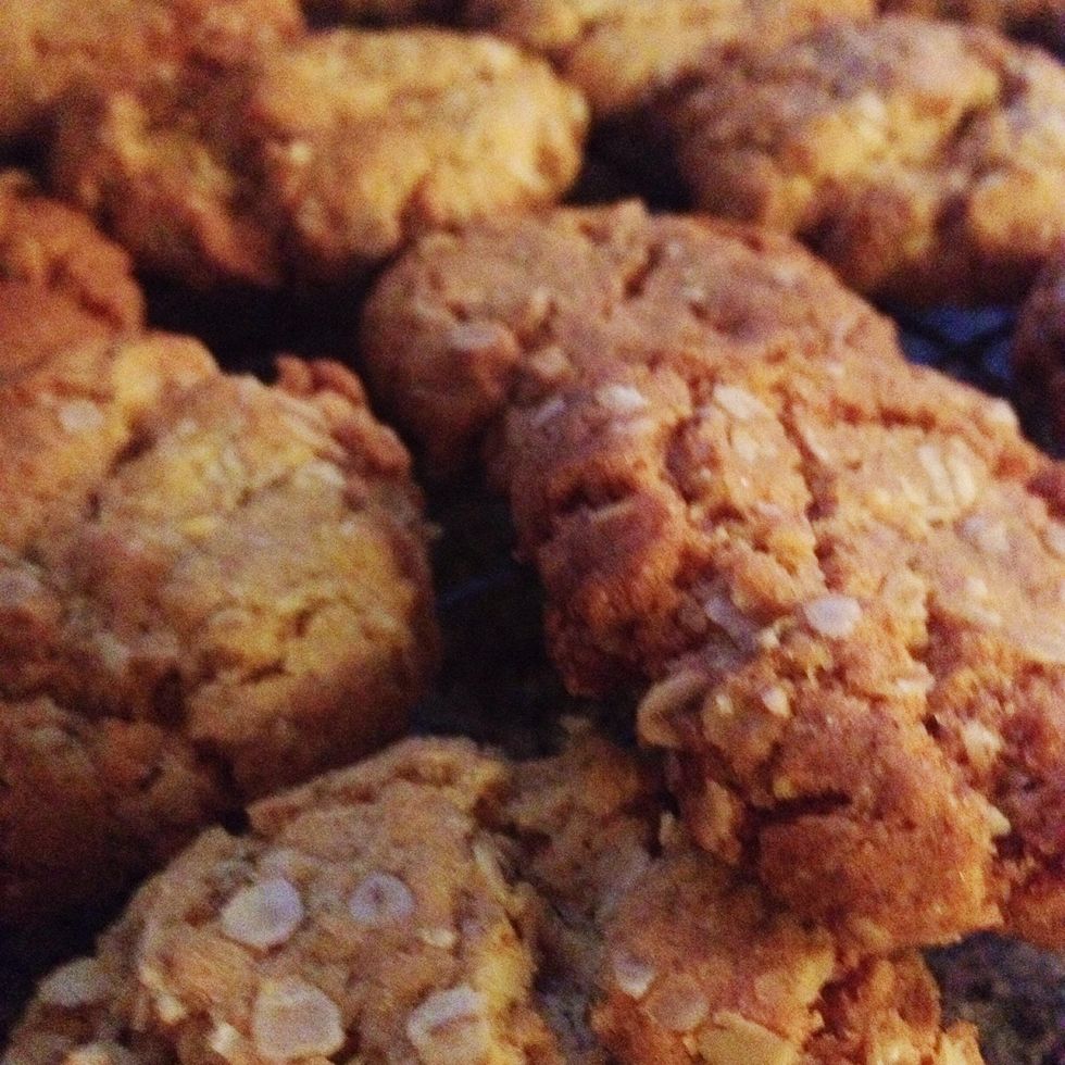 Mix the dry ingredients. Melt the butter and golden syrup then mix into the dry ingredients. Form into about 26-28 small balls. Might have to squeeze it tightly to form.