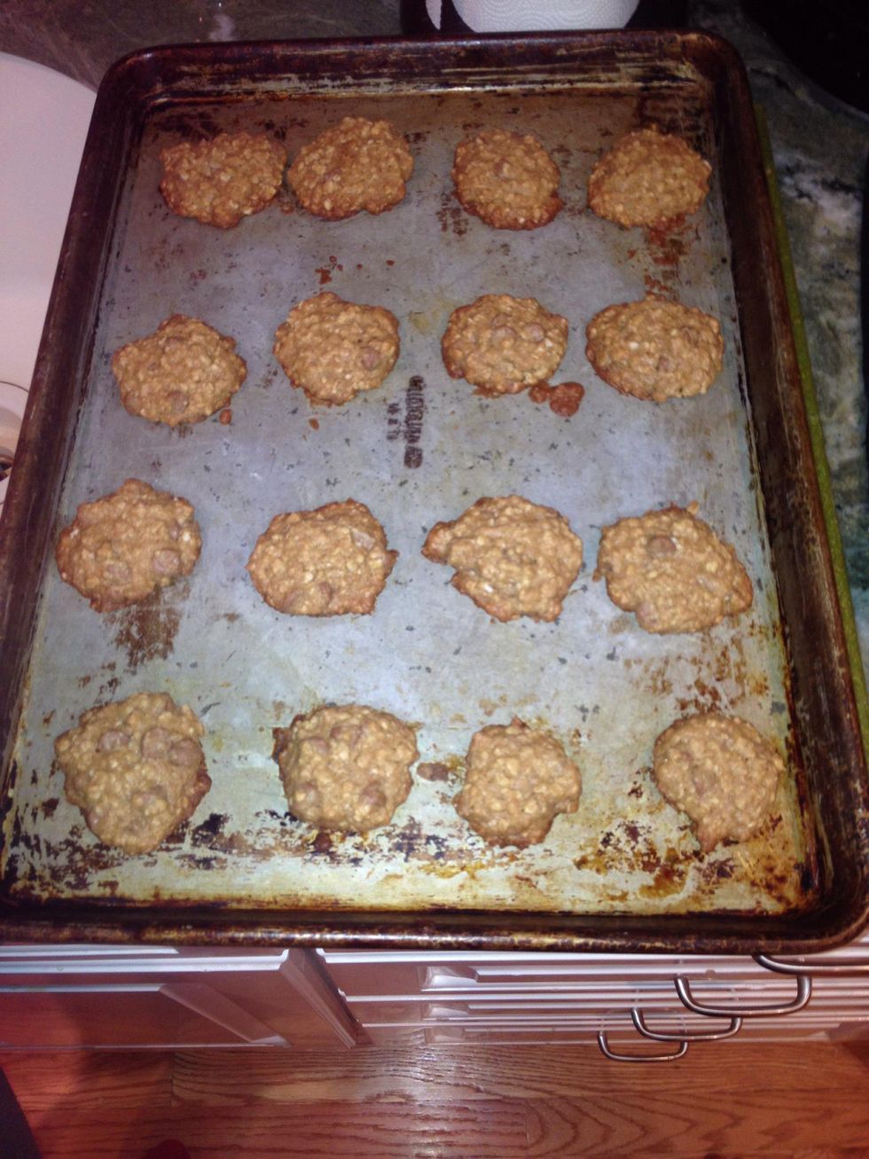 Stir in 2 cups of oats, 1 1/2 cups of flour, 1 teaspoon of baking soda, 1/4 teaspoon of salt, and 1 cup of chocolate chips