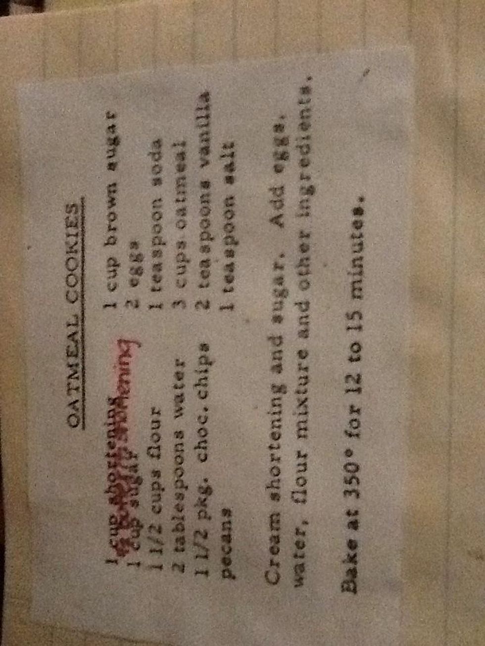 1/2c Butter and shortening1.0c Sugar1/2c Flour2.0Tbsp Water1/2c Choc. Chips and pecans1.0c Brown sugar2.0 Eggs1.0tsp Soda3.0c Oatmeal2.0tsp Vanilla1.0tsp Salt 1.Cream shortening,butter and sugar. 2.add eggs,water,vanilla, other dry ingredient 3.add oatmeal then pecans and choc. Chips