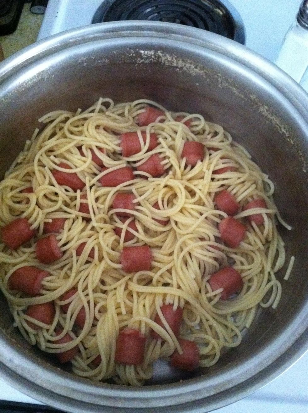You want to put 5-8 spaghetti pieces through each hotdog piece.