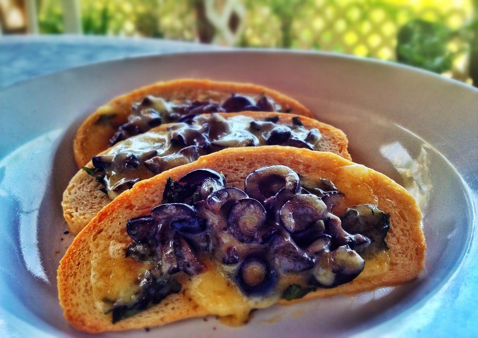 Cut basil and olives into small pieces to place on top the bread, place the bread with toppings in toaster at medium temperature for 5 minutes.