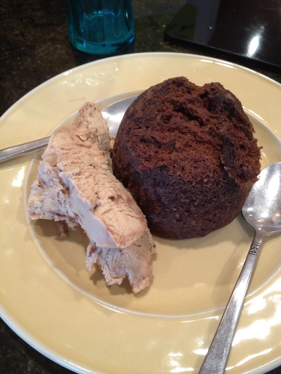 Wait 1-2 minutes then cover mug with a plate and flip over. I served it with coconut milk almond mocha fudge ice cream made by SO.