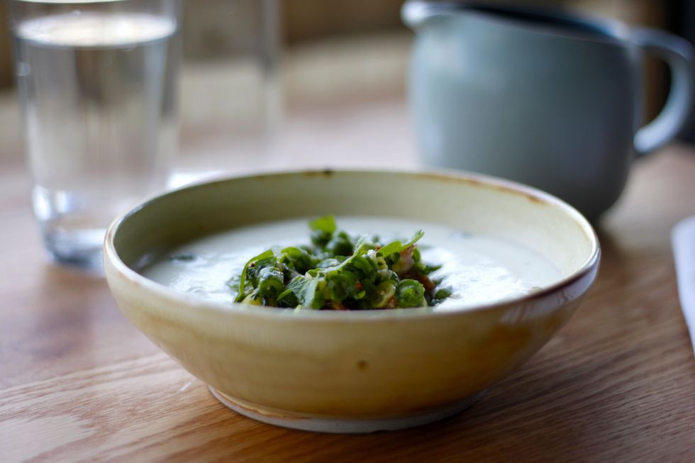 Pour soup table-side by pouring around the edge of the bowl, until just a bit of green remains on top.