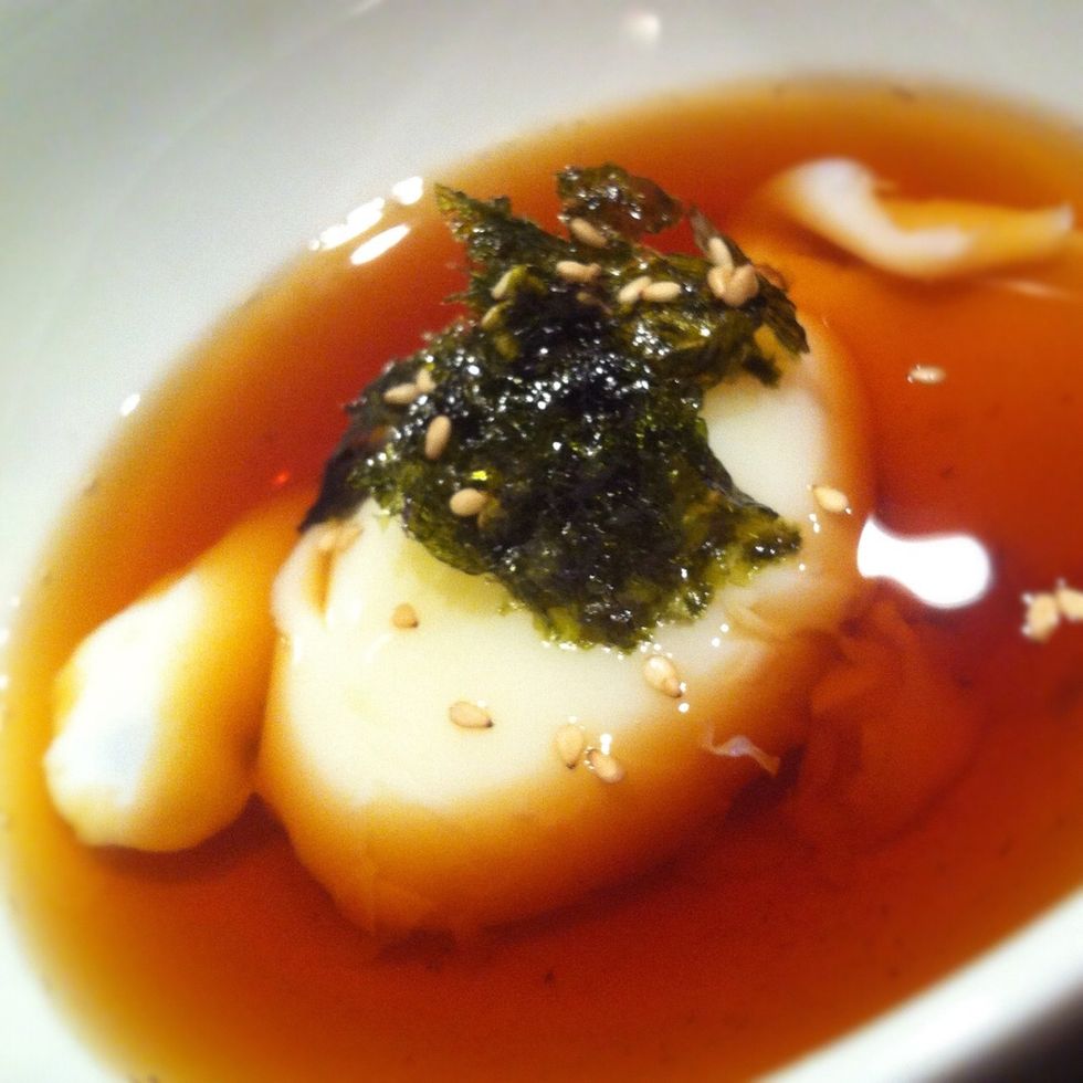 Onsen egg normally serve with dashi sauce the easiest way to make this is get soya sauce sugar and bonito flake boil them Together reduce down and pour it over ur egg they can be serve cold or warm :)