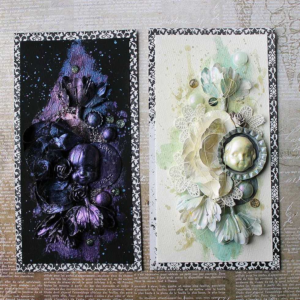 Then apply the paints. See how different the cards look and they are both done with same paints! On white surface the Opal Magic is a romantic, pearly shine and on top black it bursts into color!