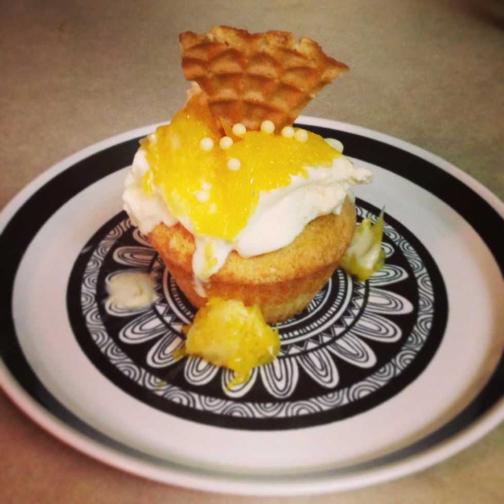 To make compote topping, chop orange into chucks. Add 1/4 cup of sugar and 2 tbs of butter into a frying pan. Cook until orange has a syrup like coating.