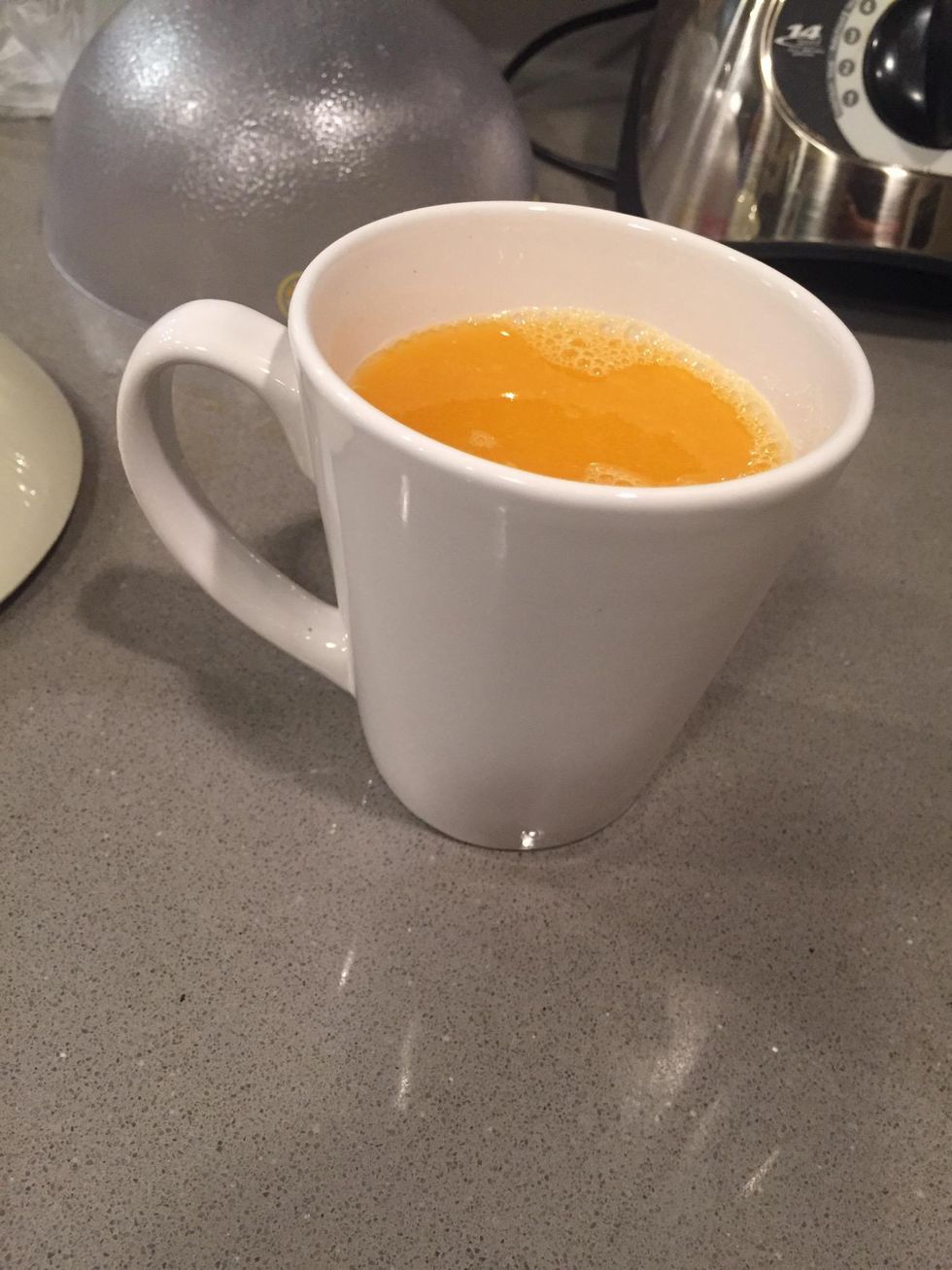 Then, grab a mug that will hold your amount of juice. It can be any size, shape, and color! I have a small cup because I didn't make a lot of OJ. ☕️