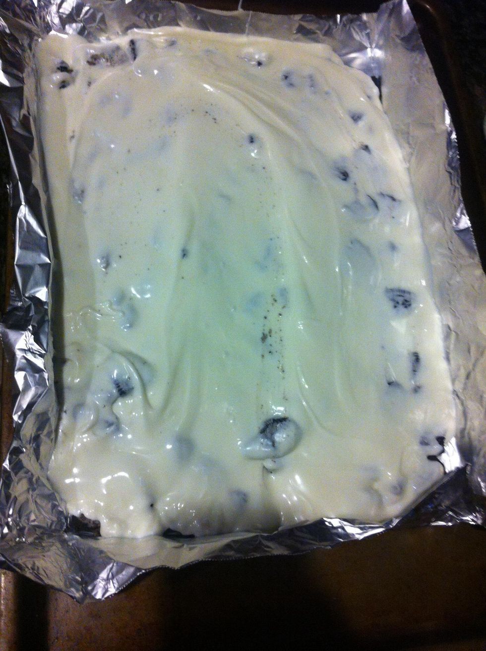 After the cookies are spread evenly, slowly pour the melted chocolate over the cookies until it is spread evenly, and covering the Oreos enough.