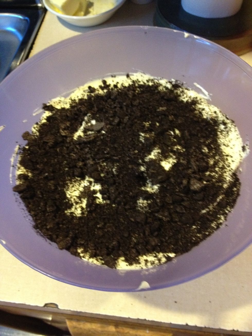 Put your Oreos in a ziplock bag and smash them. I used an ice cream scoop.