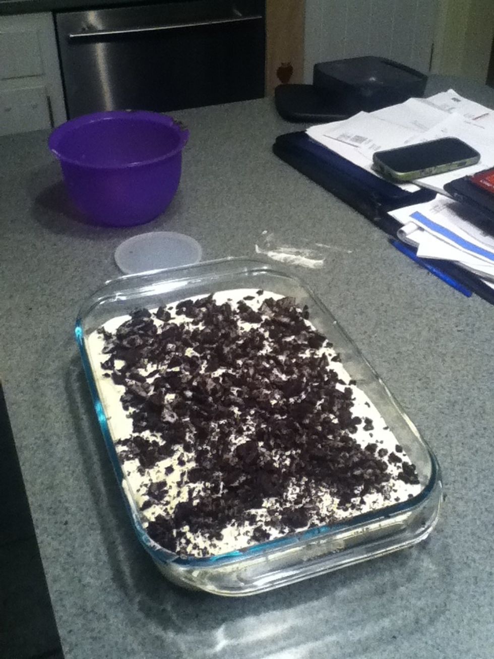 Put the whip cream and pudding that is mixed into the pan ontop of crushed oreos