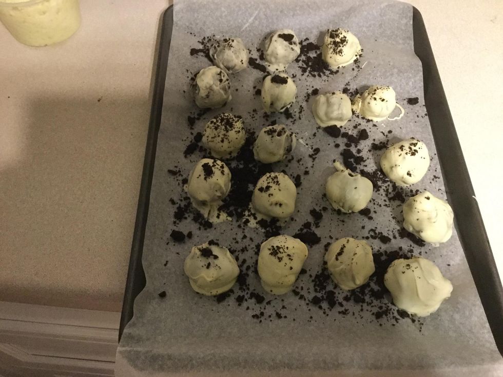 Once you have them dipped in chocolate. You then want to sprinkle Oreo crumbs on top.