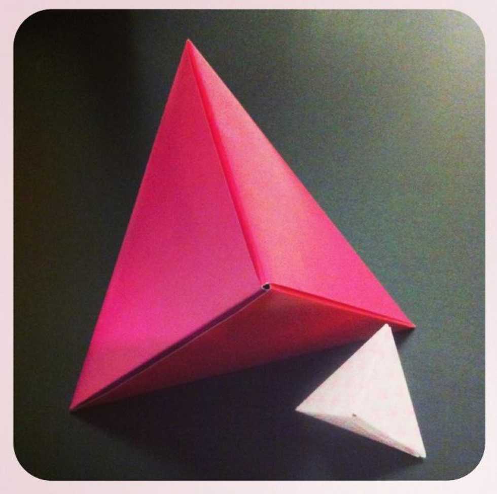 Use any size paper. Depends on what ur hiding. Fold in 1/2 diagonally. Fold in 1/2, tip to tip. Unfold. Fold right tip to top. Fold left tip to top.