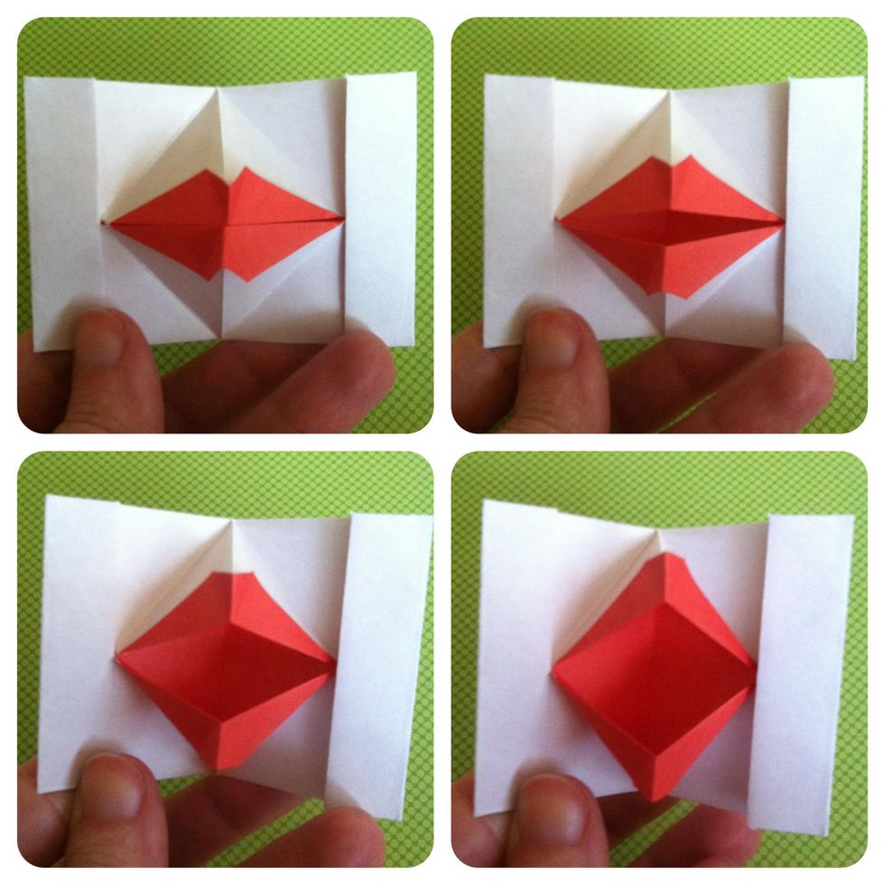 I used a 4 inch square. (pics in guide go from top left corner & clockwise around.) Color side up, fold I. 1/2 diagonally. Fold the right & left tips over to meet each others edge (folded into 3rds).