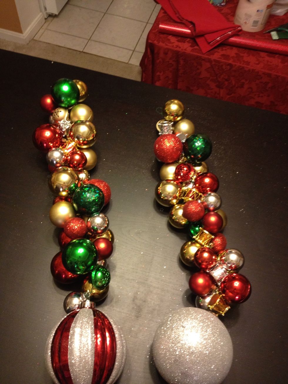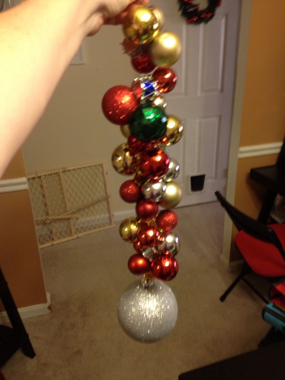 Make a hanging hole on one end and then add the ornaments, I bought mine at the dollar store