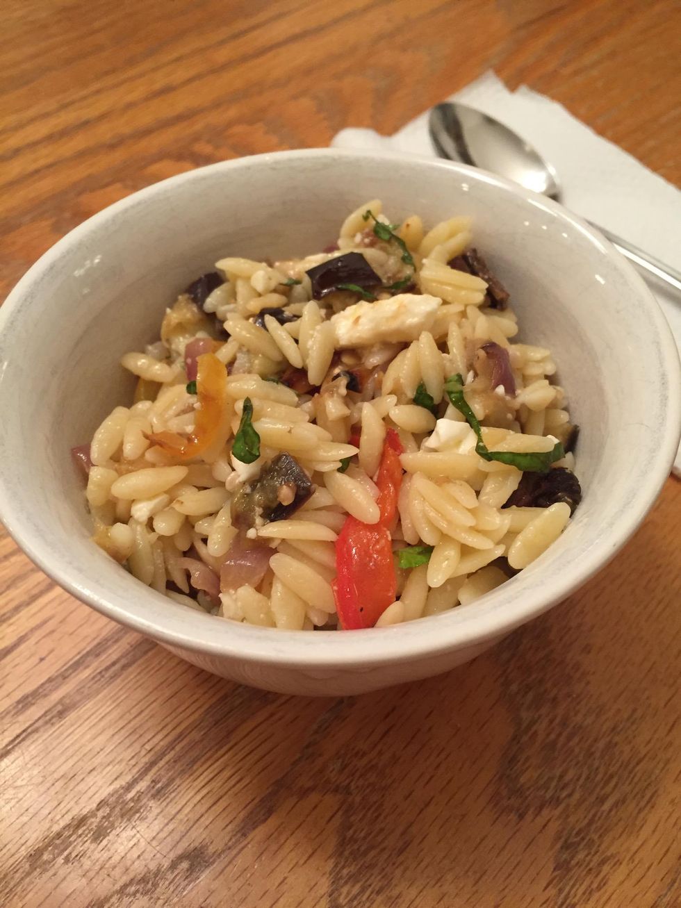 While vegetables are roasting the second time, boil orzo for 9 minutes.