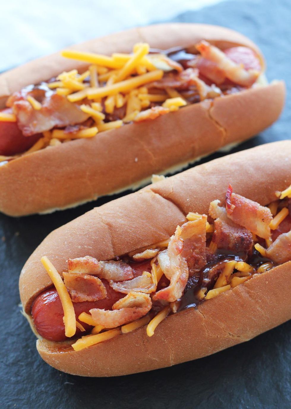 Assemble your dog: Place a cooked dog in the center of the bun and top with more cheddar and bacon.