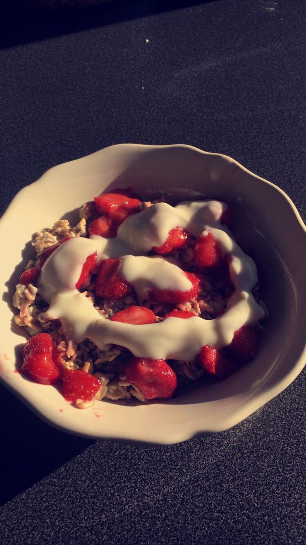Put the oats in a bowl with strawberries and soy yoghurt on topπ Enjoy π (I heated my strawberries in a casserrole with agave sirup, but you can skip this step and leave the strawberries plain).