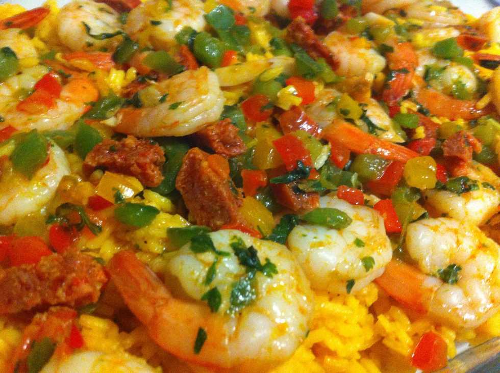 A paella inspired dish with shrimp, chorizo, and cilantro (pa-YAY-ah because it's JUST so good! Haha)