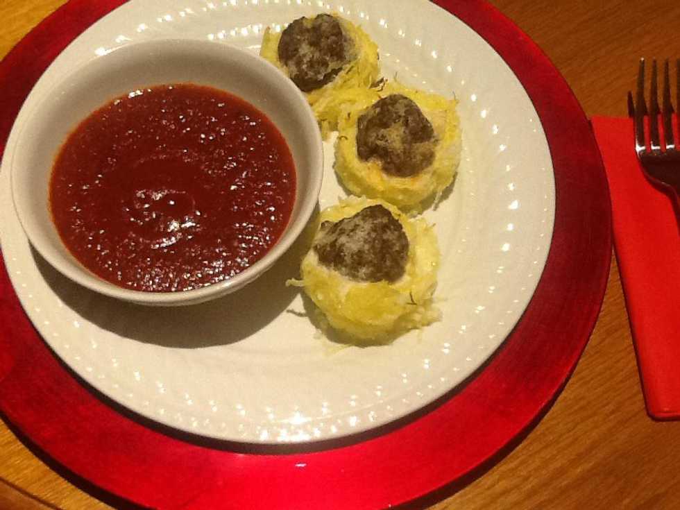 When cooked, center a cooked meatball in each cup of spaghetti squash.