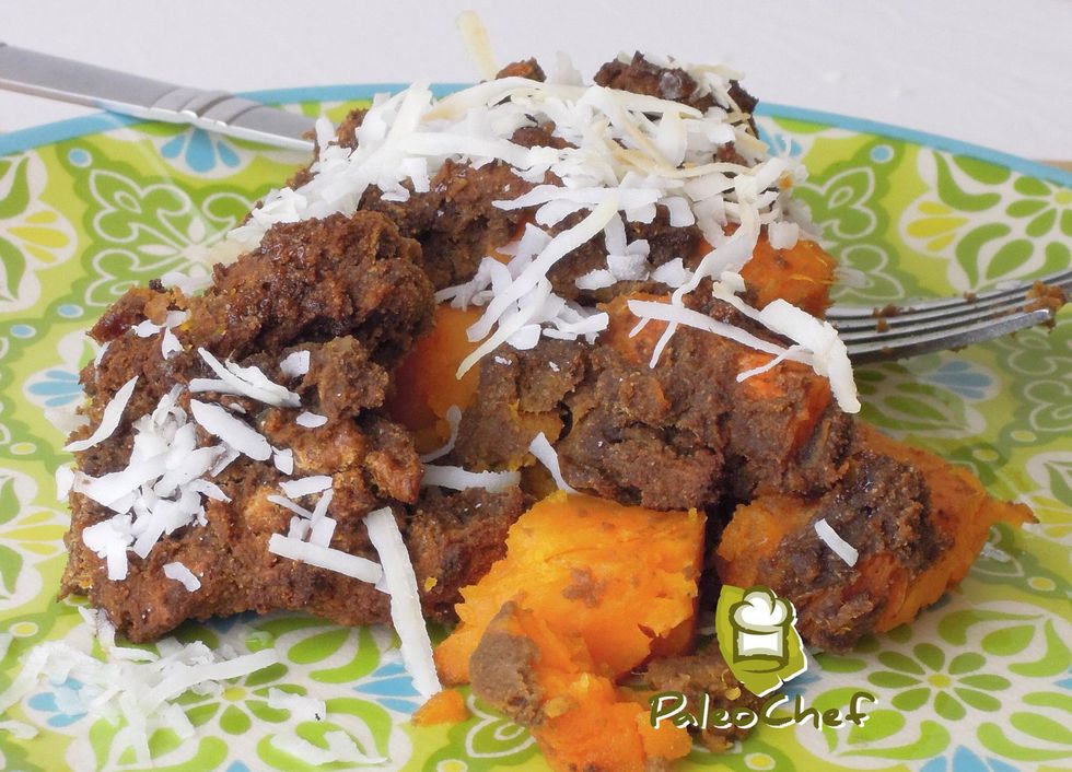 A sweet potato and brownie casserole, flavored with agave nectar and pecans, then topped with shredded coconut.. Crazy delicious and completely Paleo diet friendly!