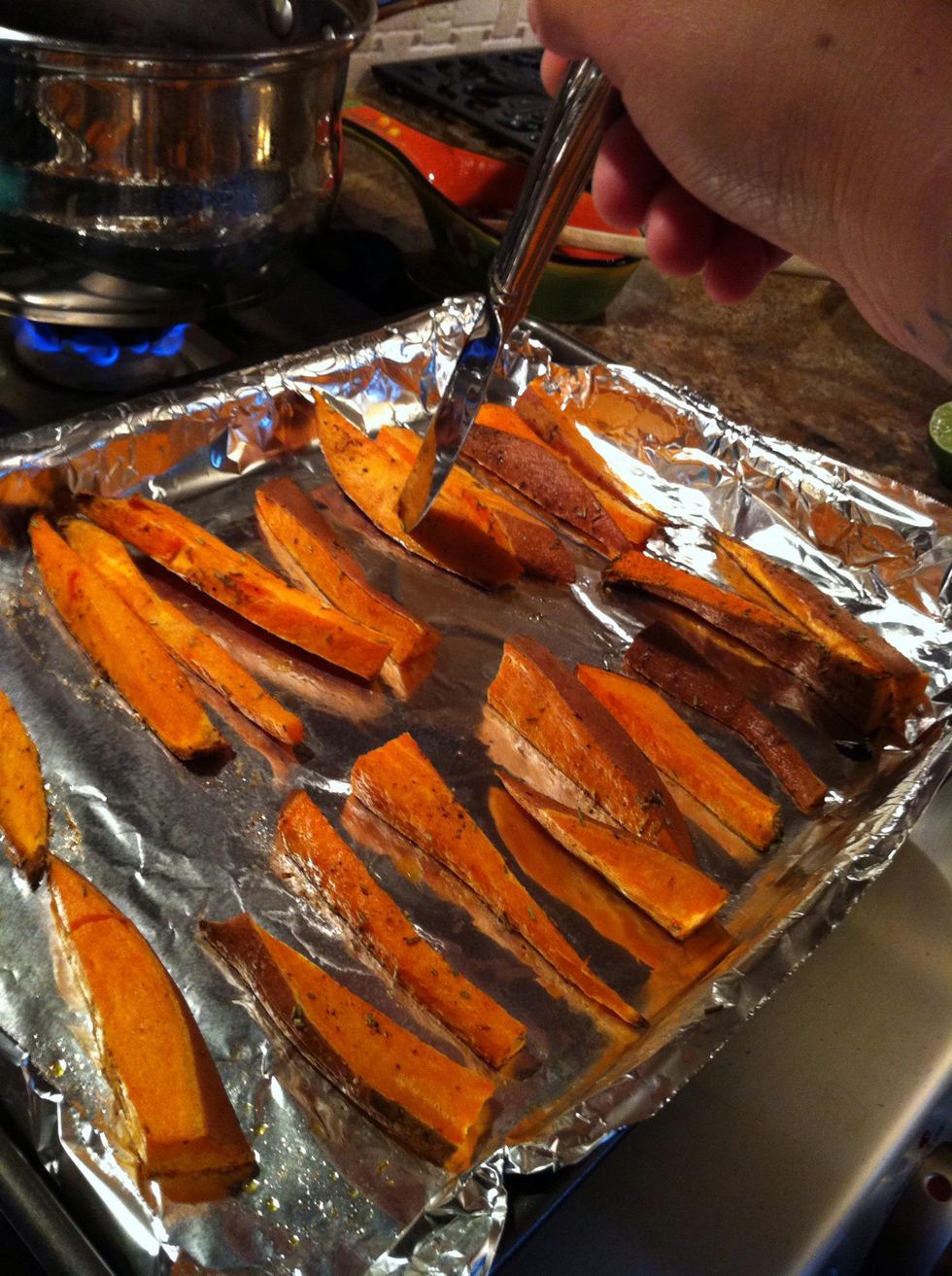 First step would be to cut the sweet potato into wedges. If you like thinner fries just cut how you like. Make sure they are the same size so they cook evenly.