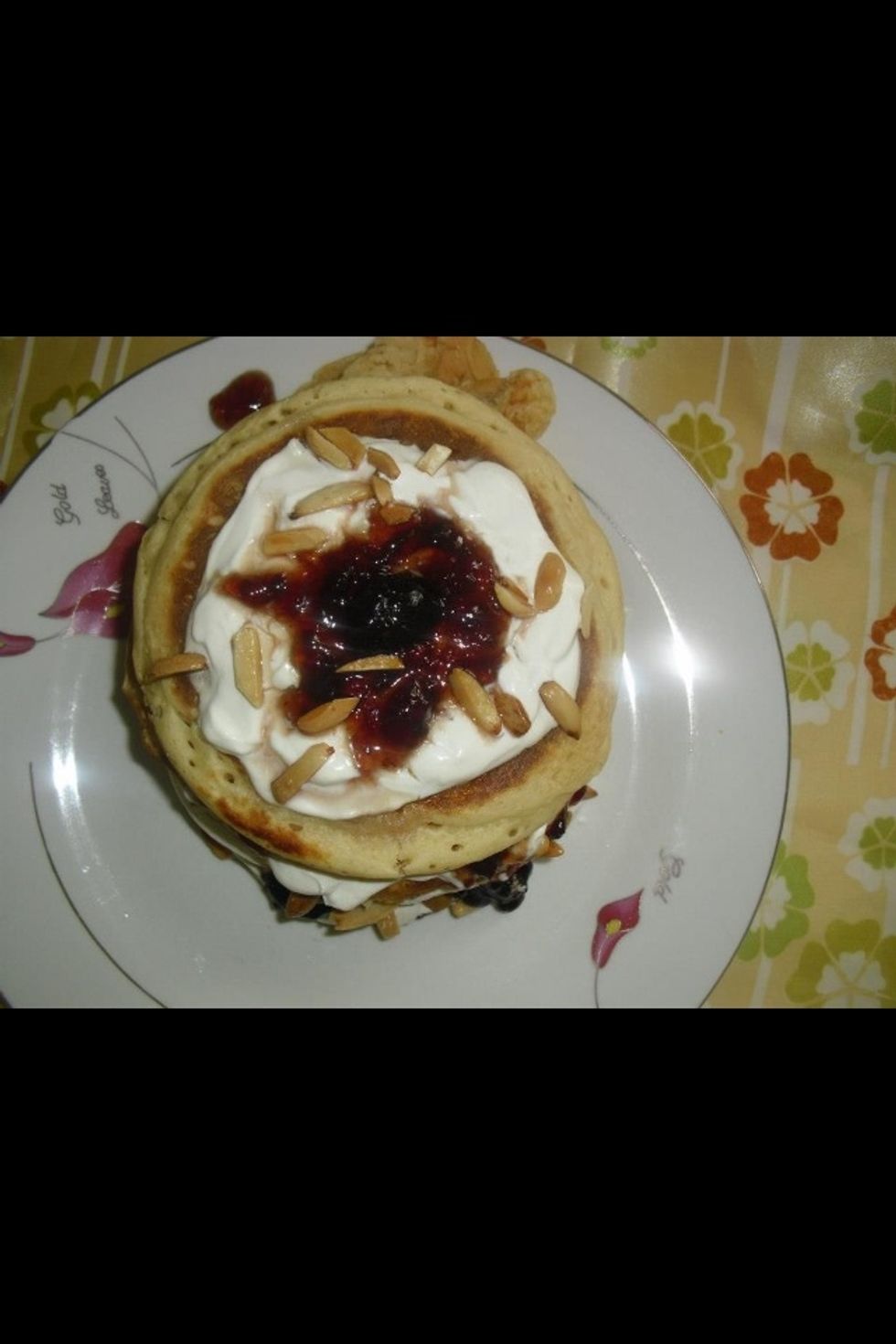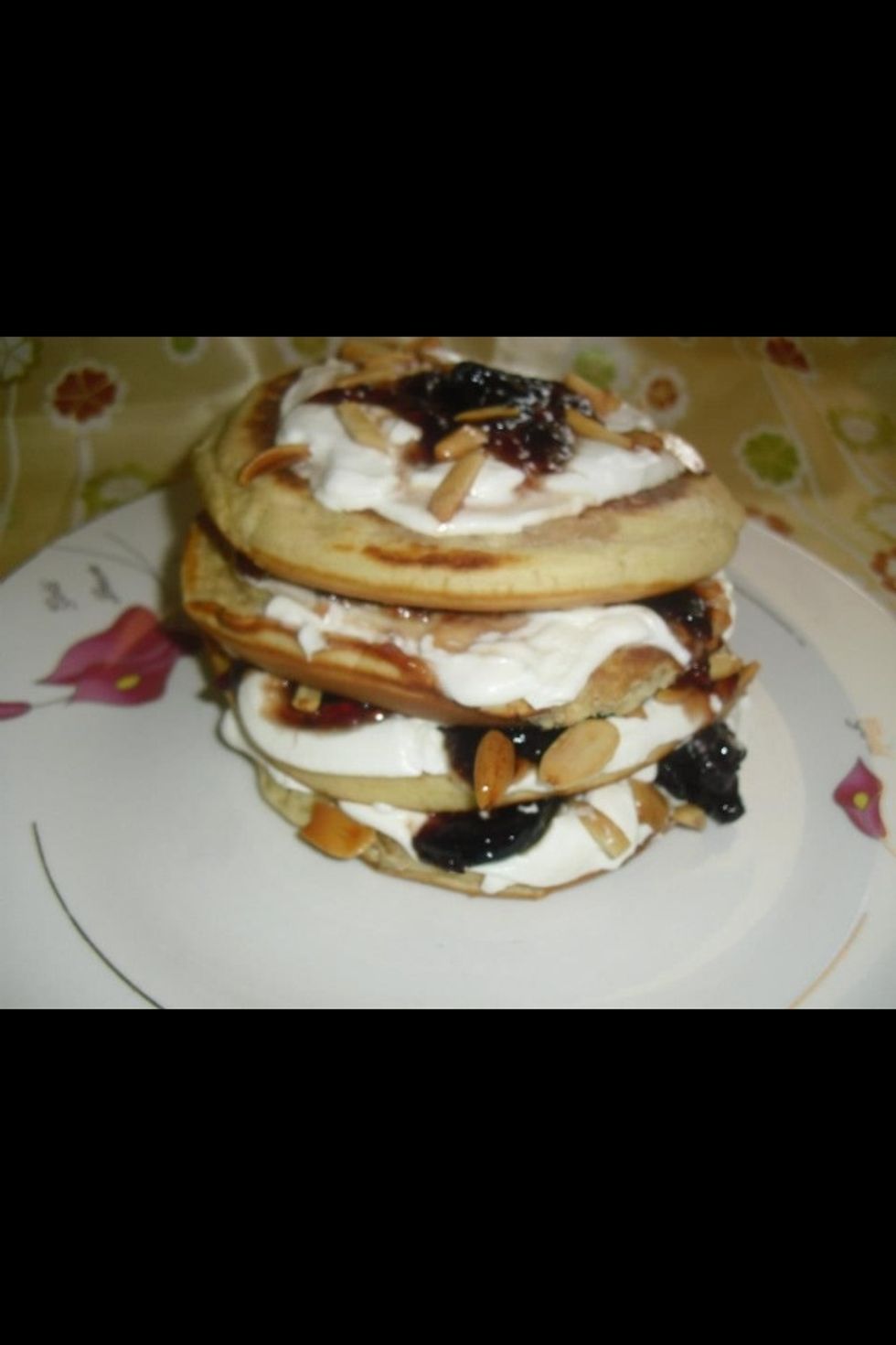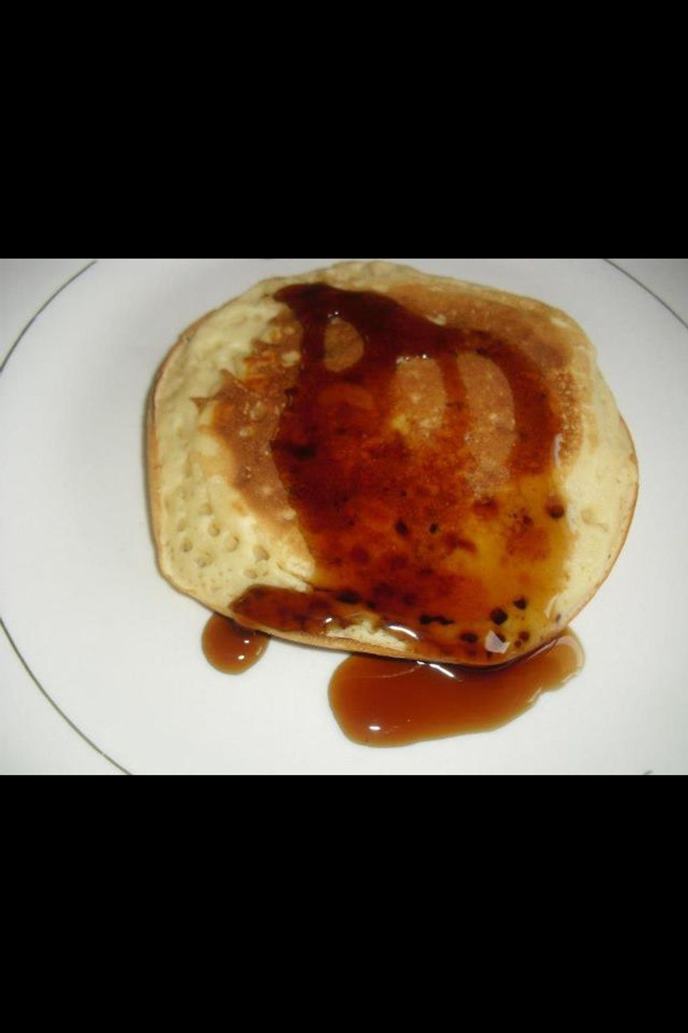 Now pour about a third of a cup of batter into the pan. This isn't exact. If you want larger pancakes, pour more. For smaller pancakes, pour less batter.