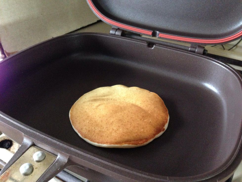 Leave the pancake for 2 minutes. You should see "moon craters" forming on the top, and the sides should puff up and rise slightly. Flip the pancake taking note to do so in one smooth motion.