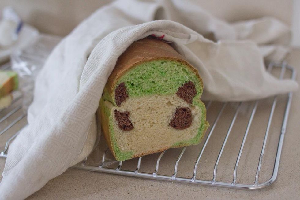 Spread out the big green piece and cover all of the other rolls with it! Put the whole thing in a loaf pan (either put baking paper or butter in the pans bottom). Let it rest under a towel for 1 hour.