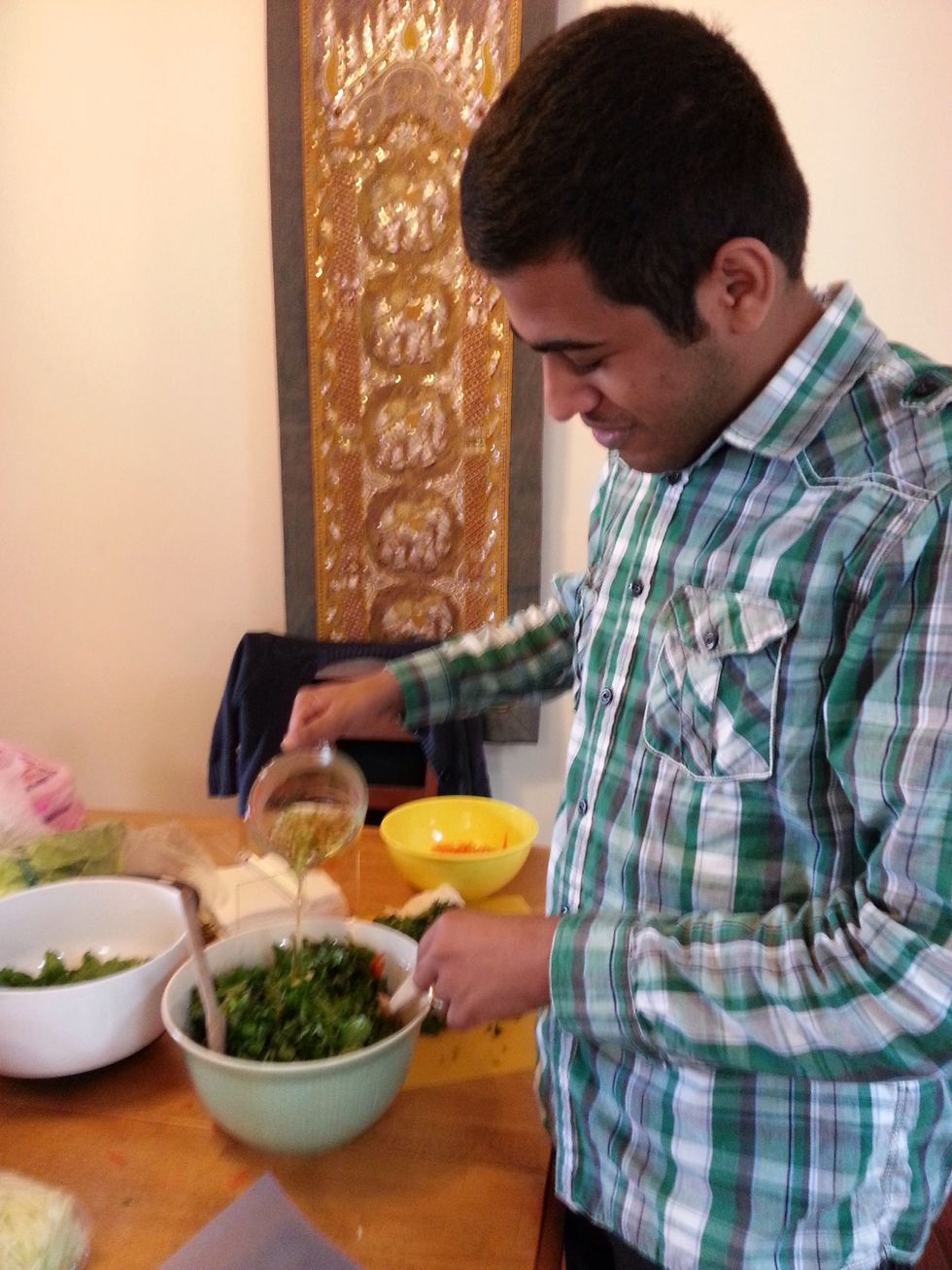 Toss shredded papaya, pickled carrots and daikon, rau ram, tia to, and mint with about 3-4 tbs nuoc mam cham sauce in a big mixing bowl.
