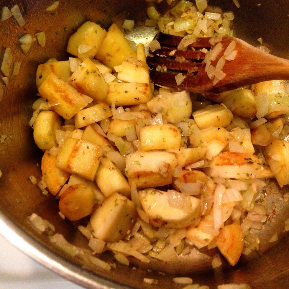 Stir. The parsnips should preferably get some color. At this stage you also add the oregano (or thyme).
